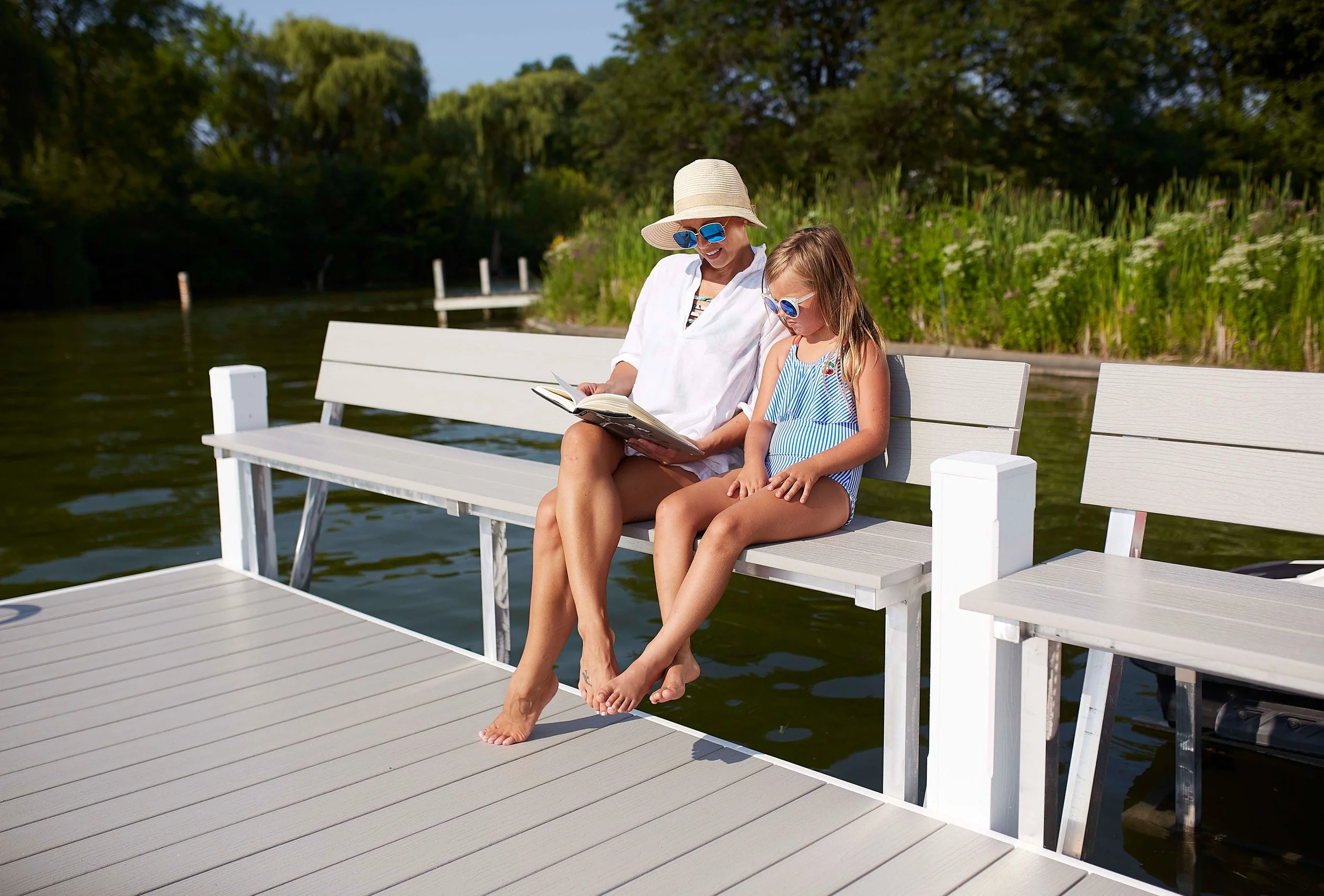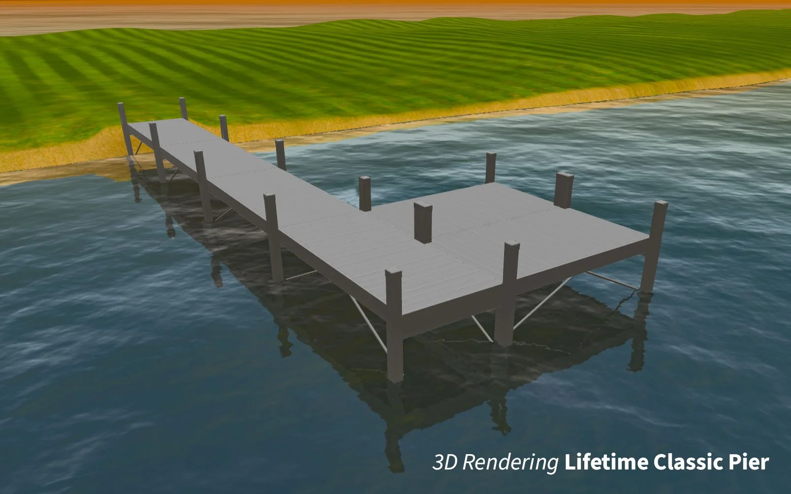 A clean, durable aluminum pier system designed for modern waterfront properties. The Lifetime Classic configuration includes a 5’ x 48’ main walkway and a