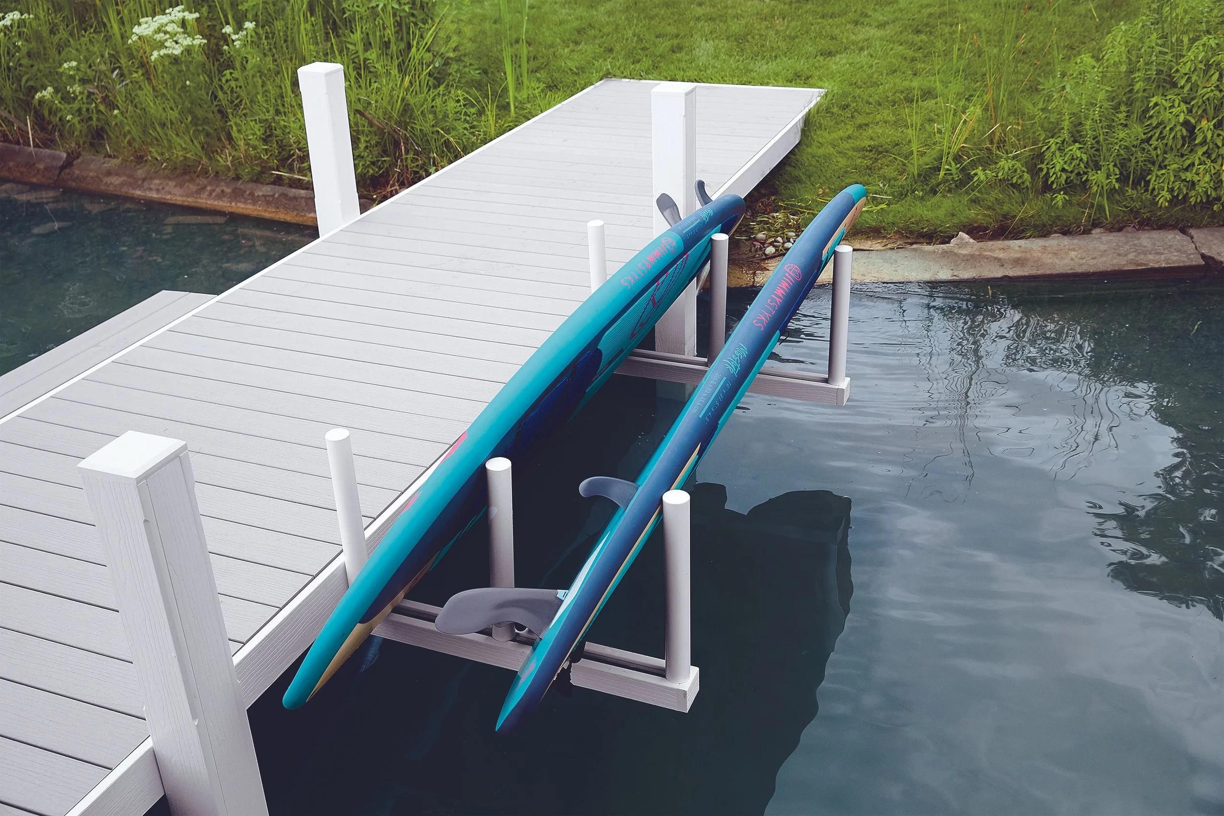 Lifetime Kayak and Paddleboard Racks are available in vertical and horizontal configurations. Rack selection and positioning are based on section width, shoreline conditions, and overall pier layout.