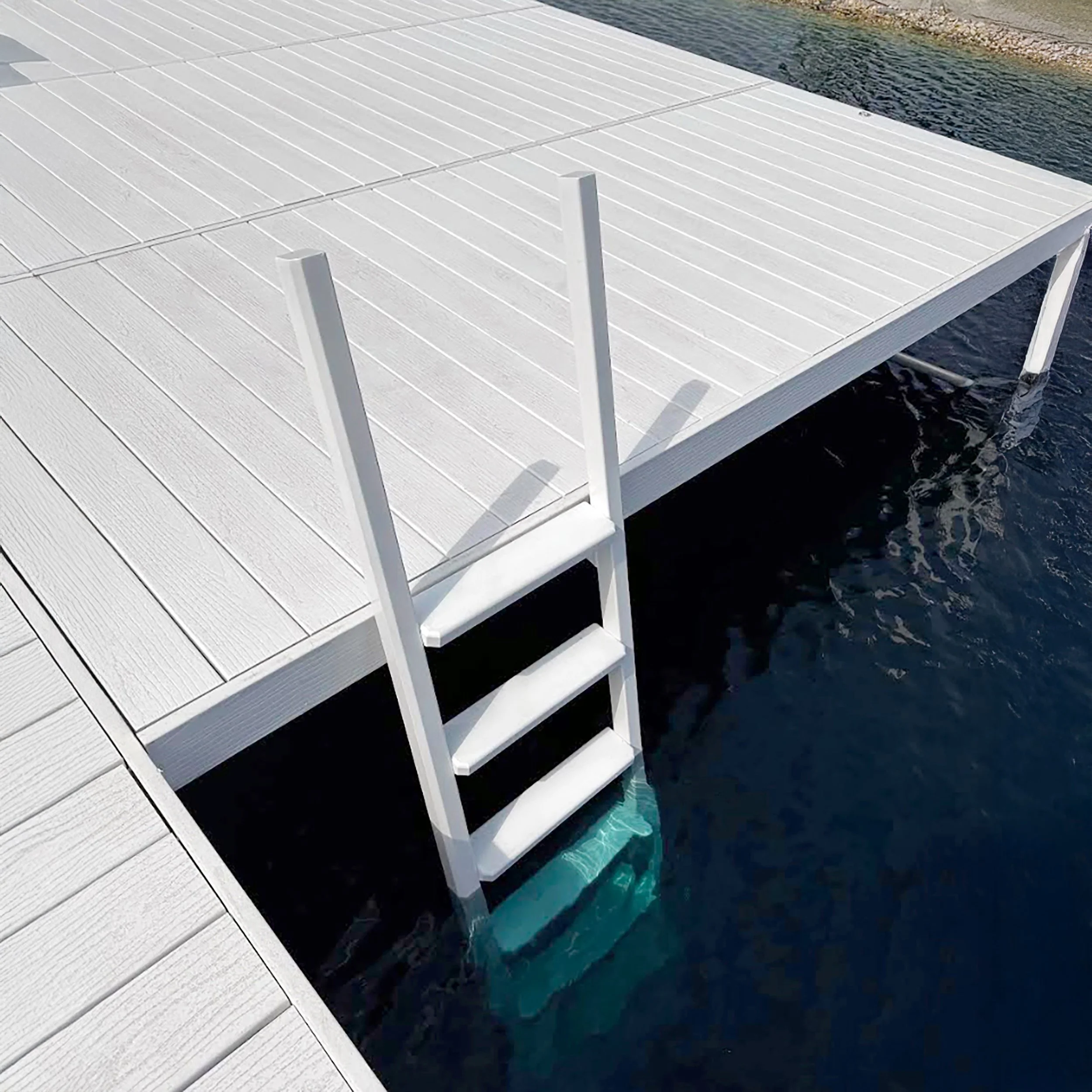 Water access accessories for Lifetime Piers® include the Lifetime Ladder and the Lifetime Stairs, which can be configured as fixed stairs or upgraded to a powered stair system. Each component mounts directly to compatible Lifetime pier sections using designated attachment hardware.